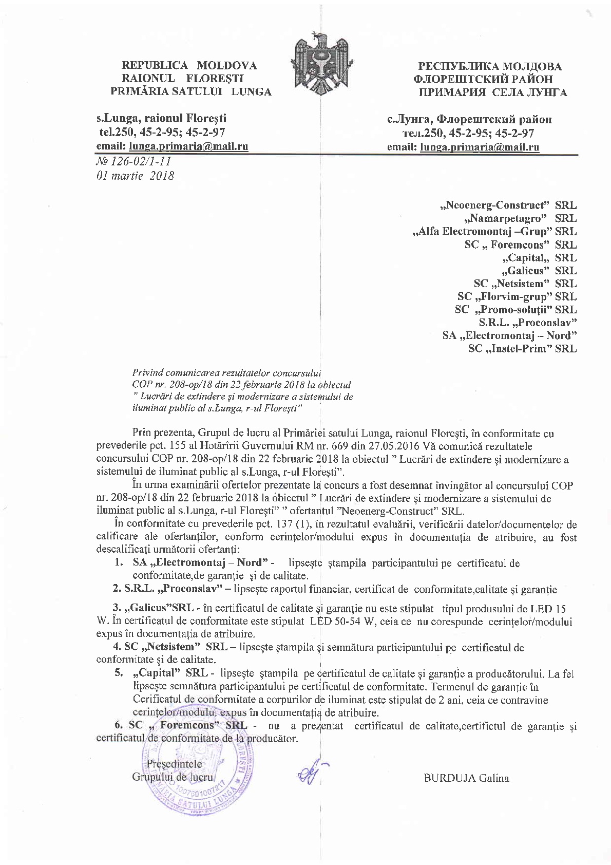 Privind comunicarea rezultatelor concursului COP nr. 208-op/18 din 22februarie 2018 la obiectul ” Lucrări de extindere și modernizare a sistemului de iluminat public al s.Lunga, r-ul Florești