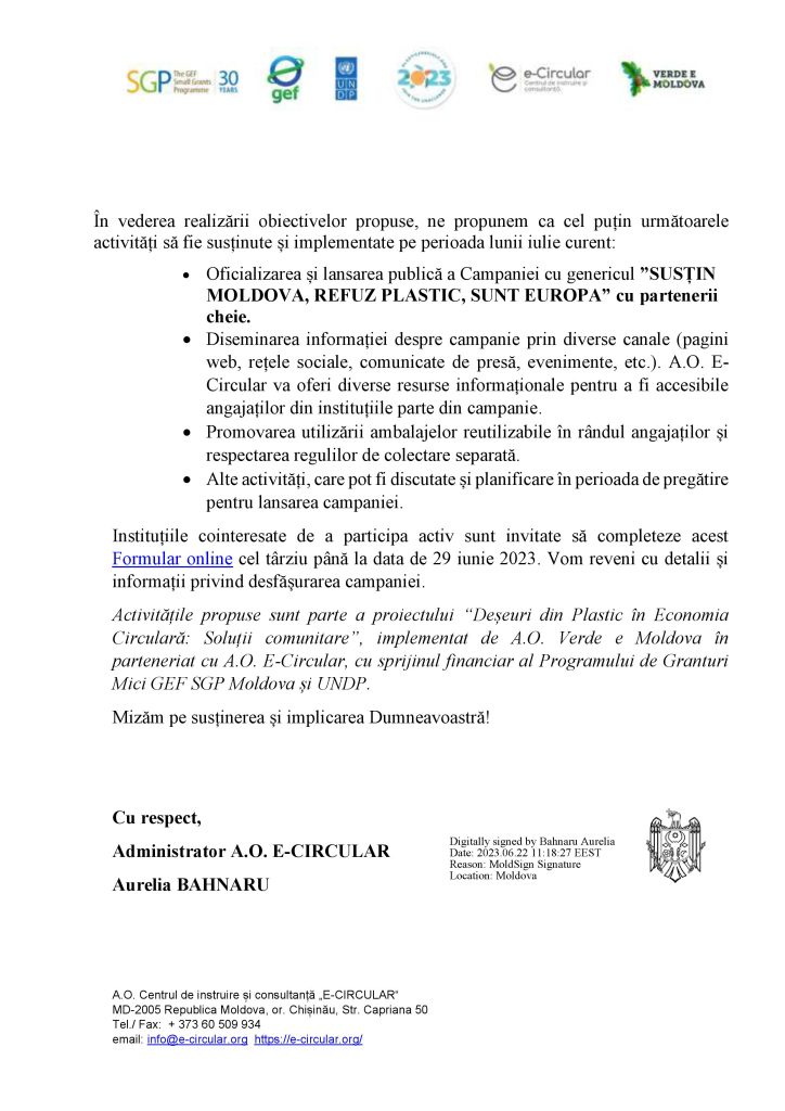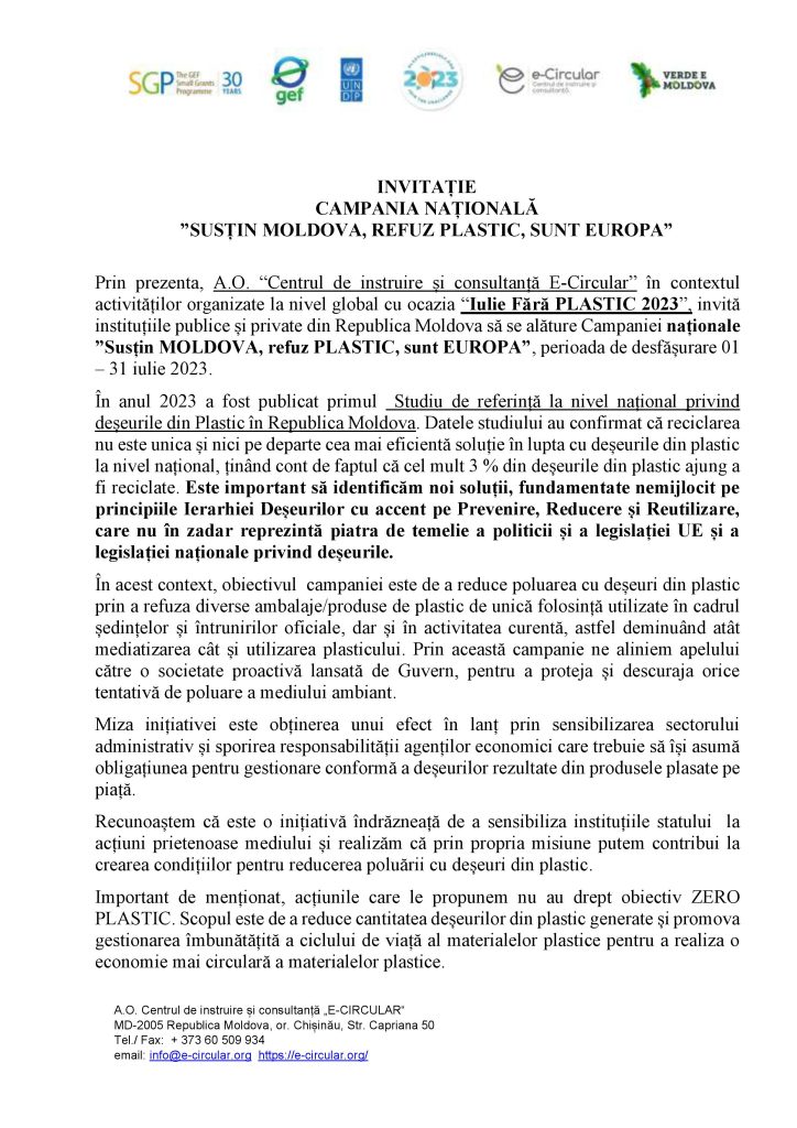 INVITAȚIE CAMPANIA NAȚIONALĂ ”SUSȚIN MOLDOVA, REFUZ PLASTIC, SUNT EUROPA” INVITAȚIE_CAMPANIE_Iulie Fără Plastic 2023.semnat Poster_Iulie Fără Plastic în Oficii
