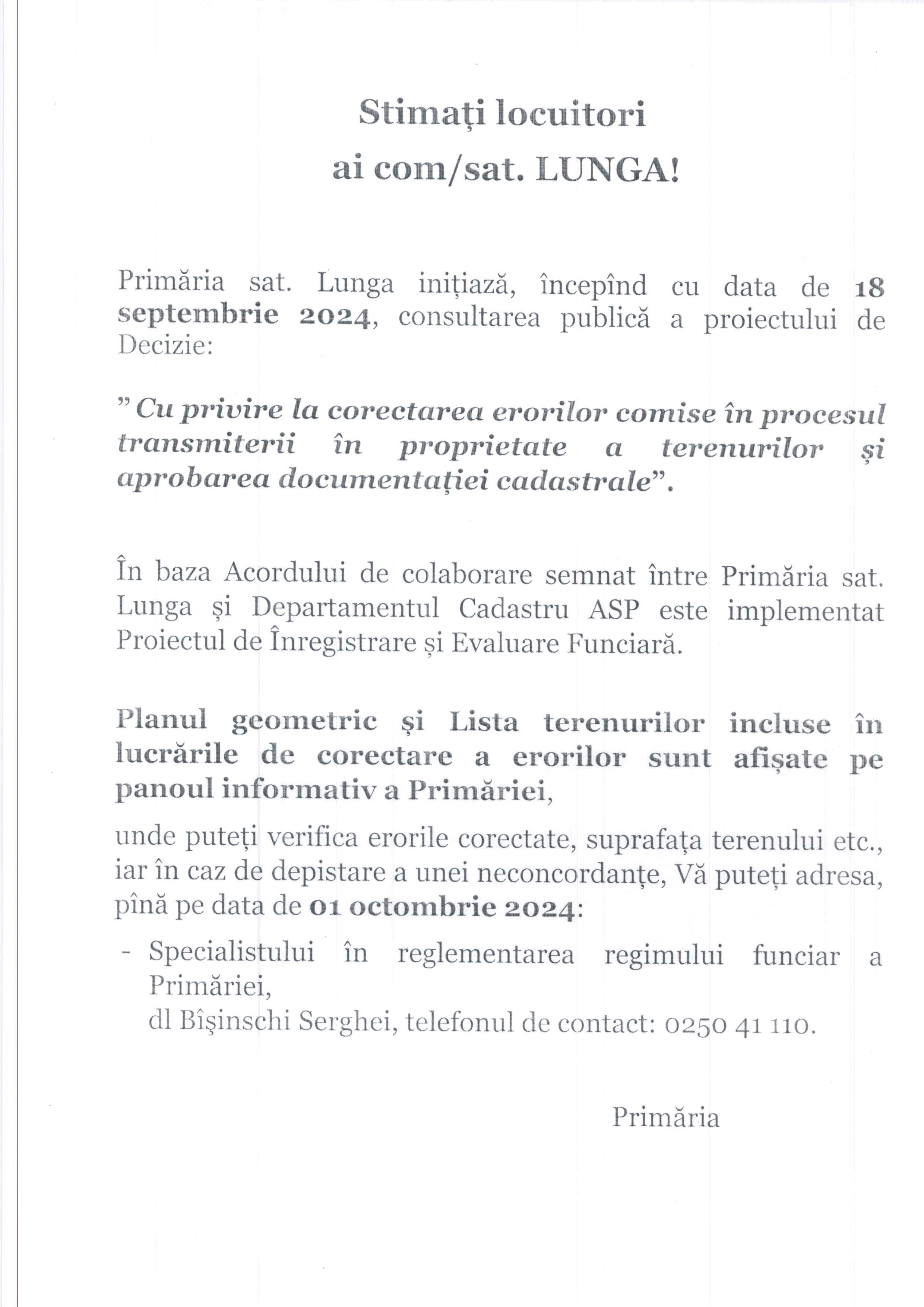 Anunțul privind consultarea publică în scopul corectării erorilor la documentația ce privește cotele de teren!!!!